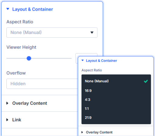Absolutely. Choose from preset aspect ratios like 16:9, 4:3, 1:1, or 21:9, or set a custom viewer height manually using the slider in Layout & Container settings.