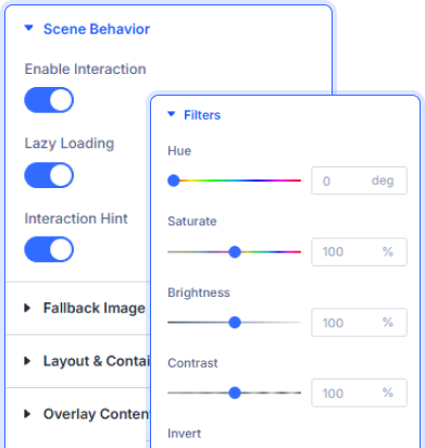 Lazy loading delays the scene from rendering until it enters the viewport, improving page load speed. Toggle it on or off from the Scene Behavior panel based on your needs.