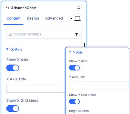 Show or hide X and Y axes independently. Add custom axis titles, toggle grid lines, and set Y axis to begin at zero for cleaner data presentation.