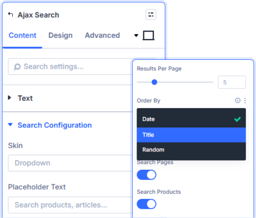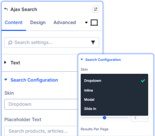 Three options — Fade In, Slide Down, or Scale Up — applied to the results container, with background color, border radius, and shadow depth styled from the Design tab.