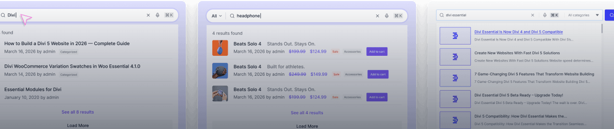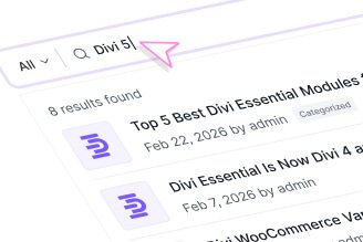 Real-time results, voice input, smart suggestions, and WooCommerce support — a Divi Ajax Search module that replaces the default search bar and actually works.