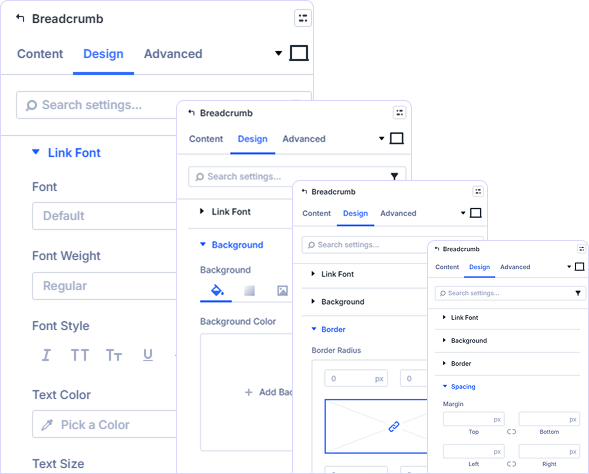 Style breadcrumb links with custom fonts, weights, colors, hover effects, backgrounds, and borders. Add ARIA labels for accessibility and apply custom CSS.