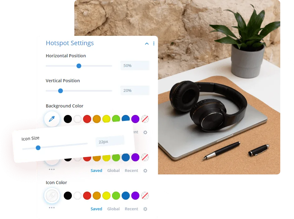 Customize your hotspots like never before with Divi Hotspot's 'Add Hotspot Color, Position & Icon Size' feature. Tailor the color, position, and size of your hotspots and icons to perfectly complement your design. Stand out, guide your visitors, and make your website truly unique.