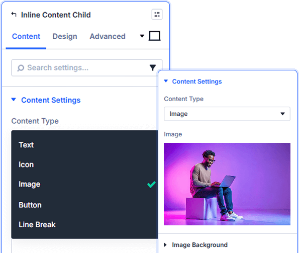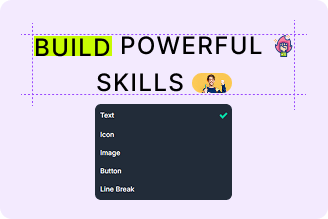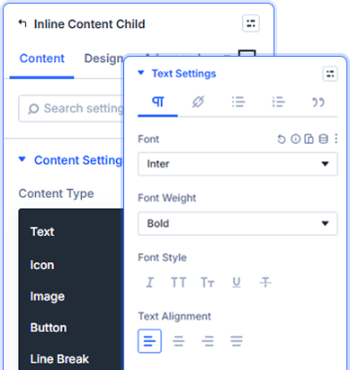 You can add five types per child item: Text, Icon, Image, Button, or Line Break. Mix any combination within one module to build rich inline layouts visually.