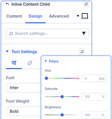 Yes! Every child item has its own Design tab with independent font, color, size, spacing, border, box shadow, filters, transform, and animation controls.