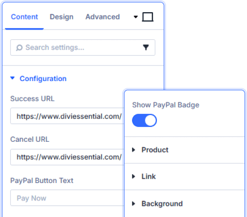 Set custom success and cancel redirect URLs. Control button text and toggle the PayPal badge on or off to match your page design.
