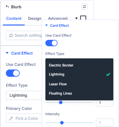 Choose Electric Border for glowing edges, Lightning for dynamic strikes, Laser Flow for light trails, or Floating Lines for elegant motion each delivers a unique visual impact.