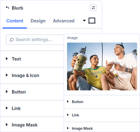 Works perfectly within the standard Divi Blurb module. Combined with heading backgrounds, description backgrounds, and image backgrounds. Full compatibility with all existing blurb features and layouts.