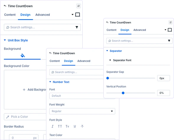 Toggle visibility for time units independently. Customize backgrounds, borders, typography, and separators. Design number and label text separately for maximum flexibility.