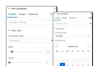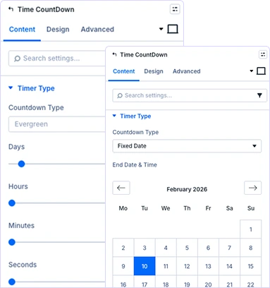 Select evergreen countdown (resets per visitor) or fixed-date timers (ends at specific time). Set precise durations with days, hours, minutes, and seconds for any campaign.
