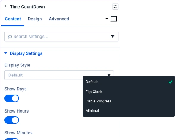 Choose from Default (boxed units), Flip Clock (animated flipping), Circle Progress (circular countdown), or Minimal (clean typography) styles. Each style is fully customizable with unique design controls.
