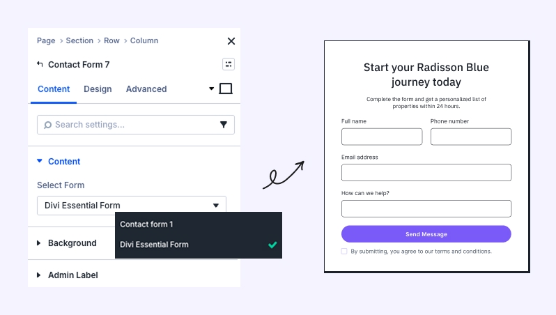 Select Form: Pick a CF7 form from the dropdown. The module renders the selected form inside the Divi layout.