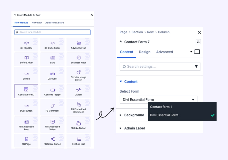 Open Divi Builder → Add Module → Contact Form 7 Customizer.