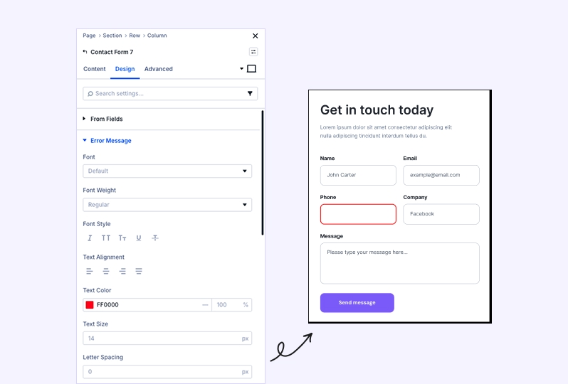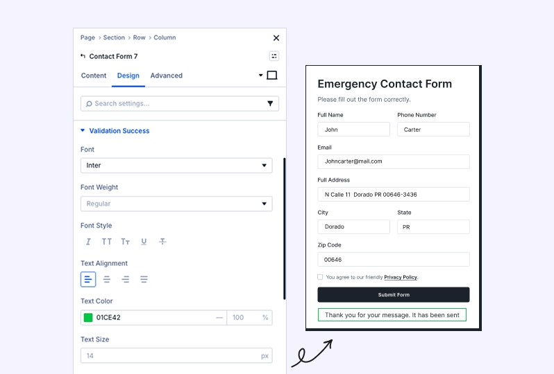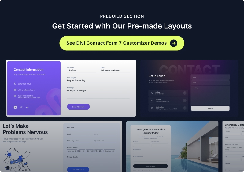 Contact Form 7 Customizer lets you bring any Contact Form 7 (CF7) form into the Divi Builder and style it with pixel‑perfect control—no CSS required. Select a CF7 form, then customize labels, inputs, placeholders, radios/checkboxes, file fields, selects, and the submit button. You can also style validation states (error/success), spacing, borders, shadows, filters, transforms, and animations.