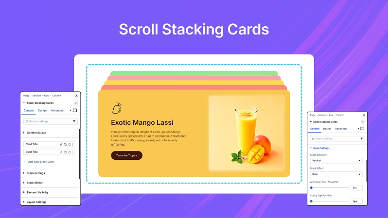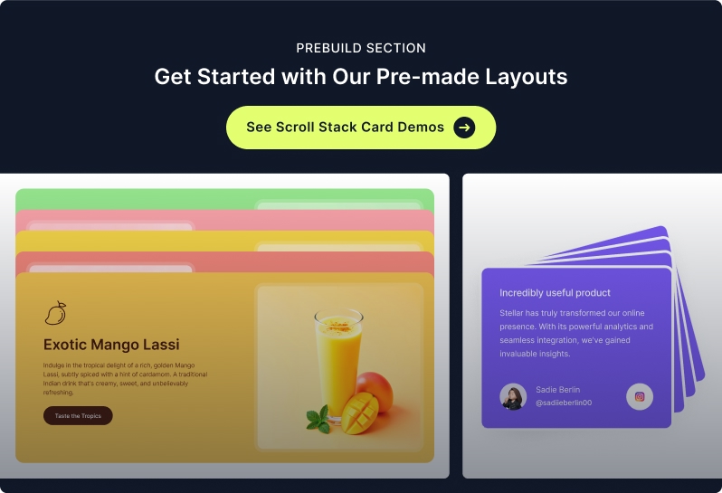 The Scroll Stacking Cards module for Divi Essential (Divi 5) is designed to transform standard content into an immersive storytelling experience. As users scroll, each card sticks to a designated position while the next card slides over it, creating a visually rich “stacking” effect. This is perfect for features, processes, or portfolio highlights that require a modern, high-end feel.