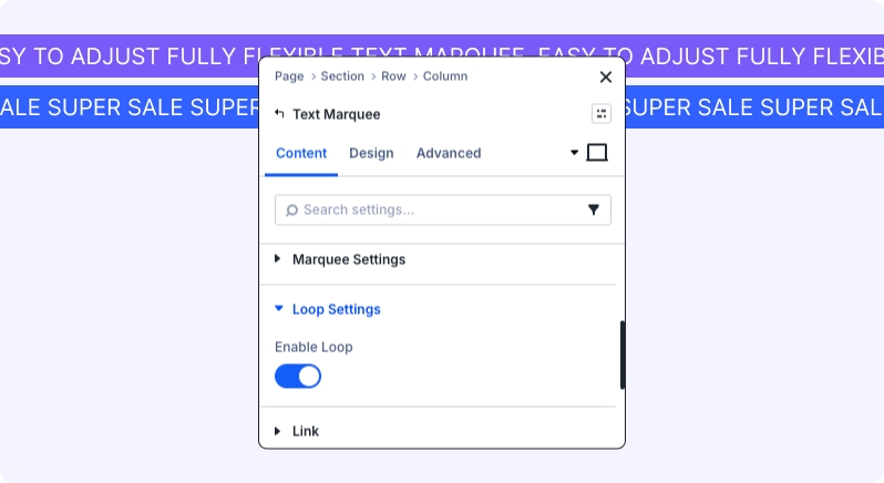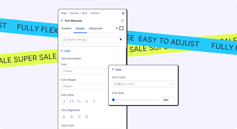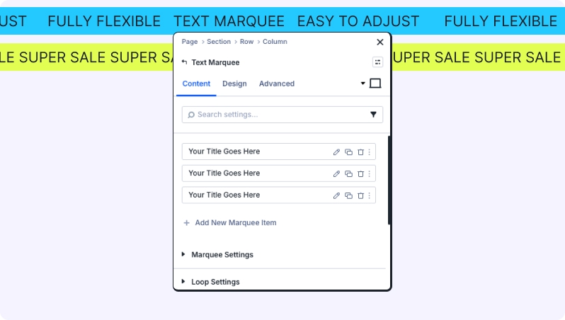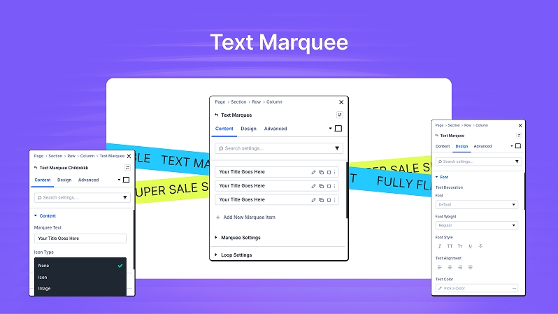 The Text Marquee module allows you to create dynamic scrolling text effects for headlines, announcements, or promotional messages. You can add multiple marquee items, customize scrolling direction, speed, and hover behavior, and apply advanced styling. Each marquee item is managed through Text Marquee Child, giving you granular control over text and optional icons.