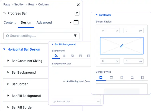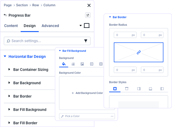 Absolutely! Control every visual aspect including bar container backgrounds, fill colors, borders, shadows, and percentage text styling. Match your brand perfectly with complete design freedom.