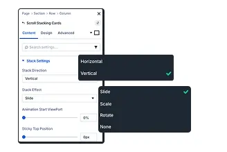 Yes! Choose vertical or horizontal direction, select effects (slide, fade, zoom), adjust animation viewport percentage, and set sticky position for complete control over the stacking behavior.